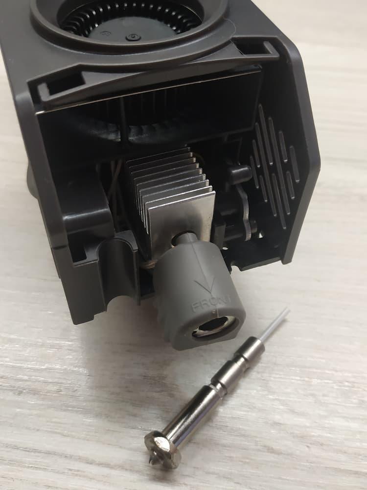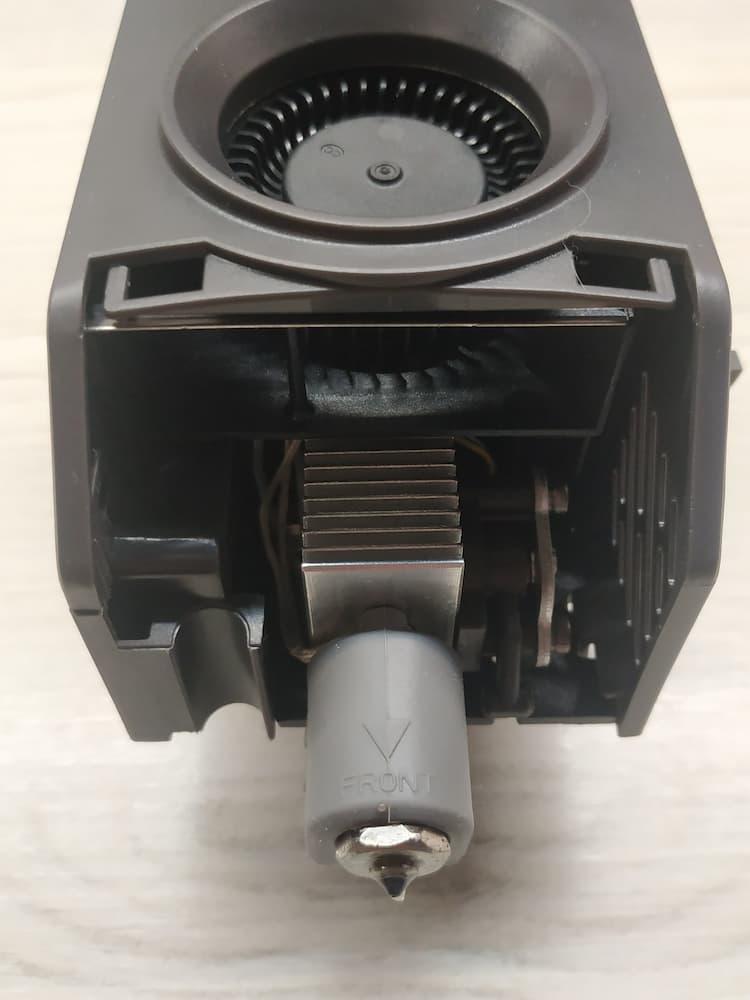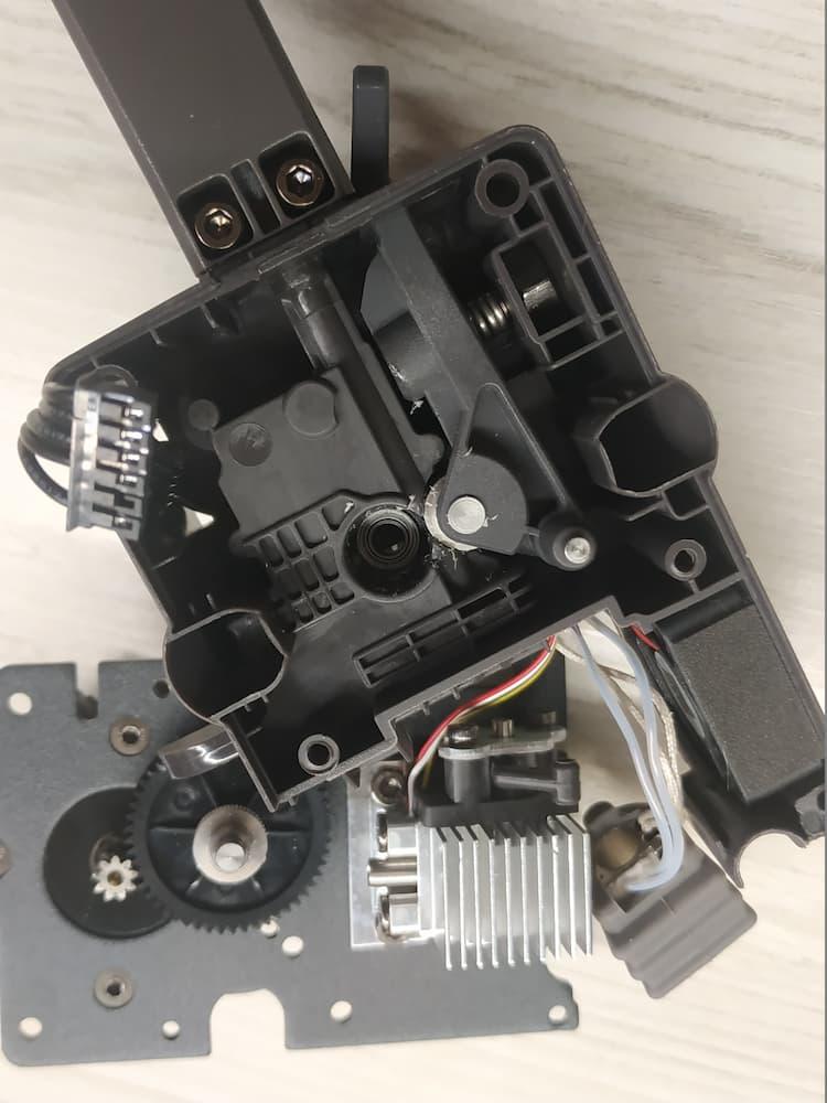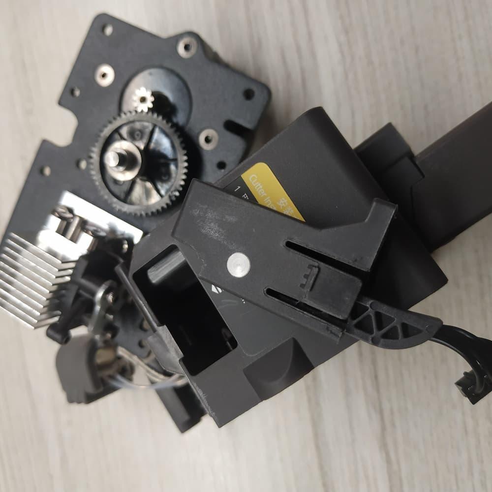 Сбоку головы нож для обрезки филамента, вынимается очень просто. На фото под рычажком есть лепесток, его отгибаем вверх и вытаскиваем модуль с ножом.