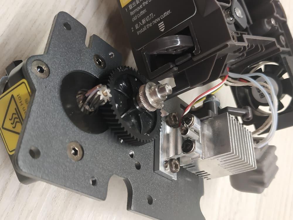 Отсоединяем разъём от мотора. Теперь если аккуратно вскрыть корпус, увидим редуктор экструдера.